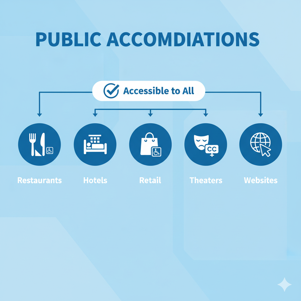 ADA Title III applies to public accommodations under ADA, such as restaurants, hotels, retail stores, theaters, and online businesses. It requires that these facilities and services are accessible to all.